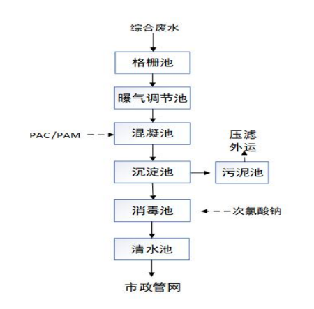 医院 新建 污水处理站 规模为 1500 m 3 /d , 采用 格栅+曝气调节+沉淀+次氯酸钠消毒处理工艺。污水处理站工艺流程见下图: