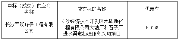 长沙经济技术开发区水质净化工程有限公司大塘厂和石子厂进水渠道捞渣服务采购项目采用询比方式,现将采购结果公告如下: